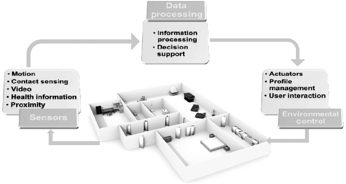 The Smart Home Paradigm with the three main components of sensors, data processing and environment control | https://www.researchgate.net/figure/The-Smart-Home-Paradigm-with-the-three-main-components-of-sensors-data-processing-and_fig2_220144286