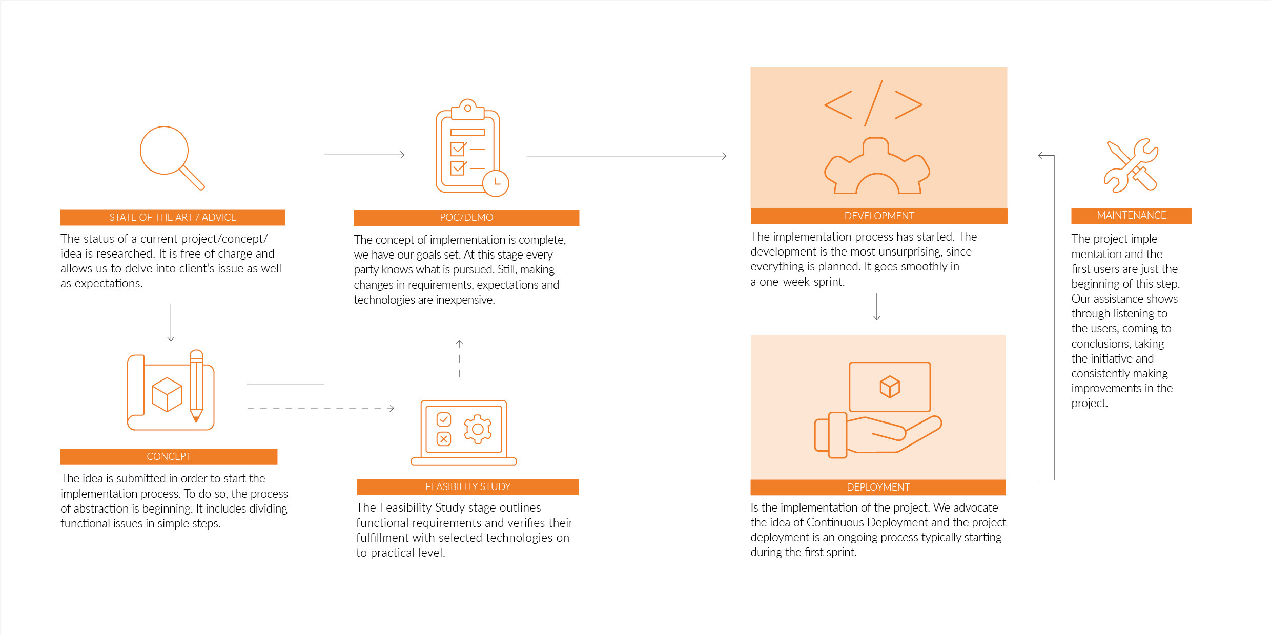 From a few weeks to a few years. It really varies. The shorter ones are projects such as designing a piece of software, designing a UIX, designing test procedures or simply providing an opinion on existing software developed by a third party. But our favourite projects are the long-term ones, where we create a complete solution from concept, through the feasibility study, PoC, proper implementation, deployment and further development and maintenance. In particular, the most successful projects never “end” but evolve and develop, living their own happy lives.